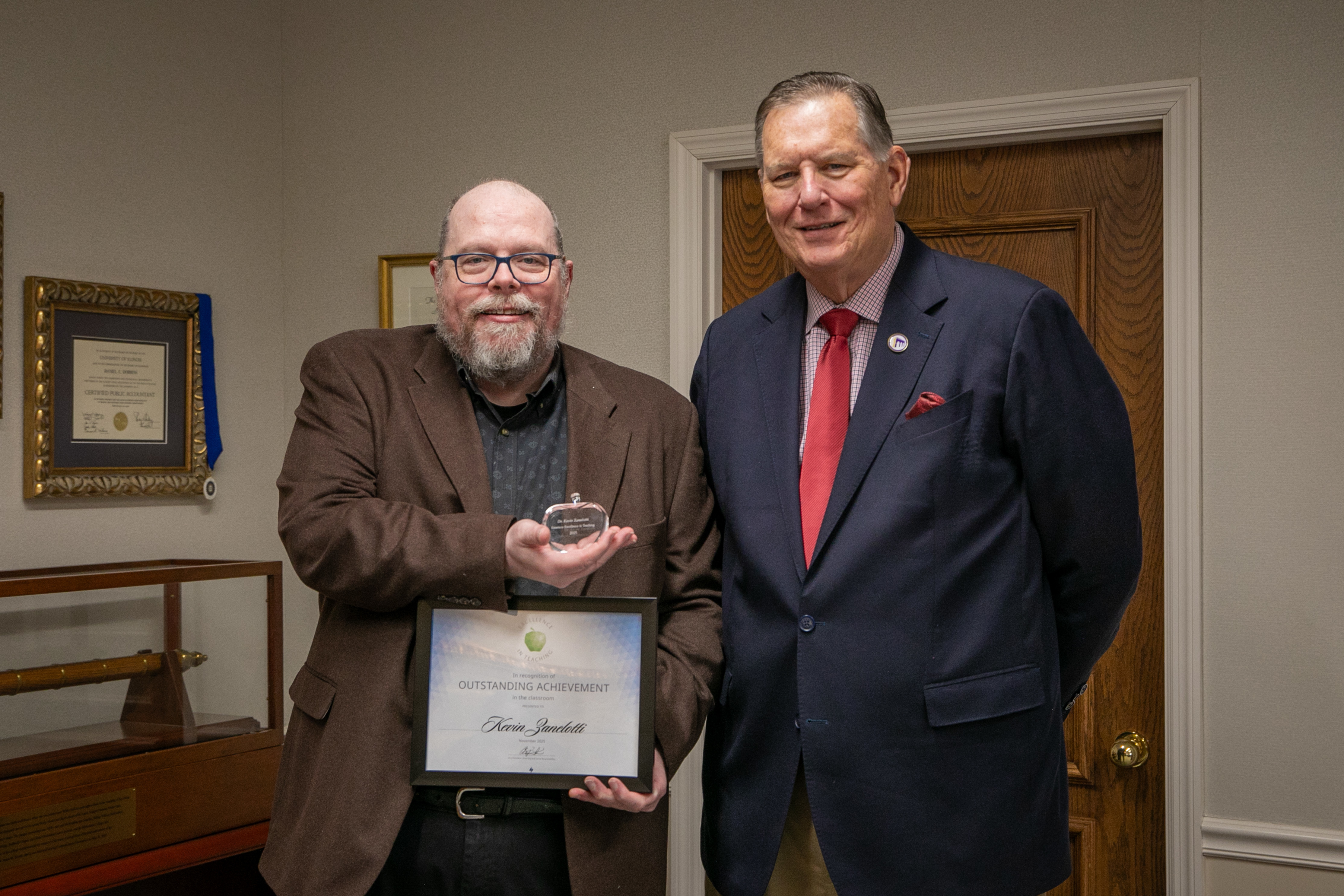 Lebanon, IL (12/04/2025) — Dr. Kevin Zanelotti, professor of philosophy at McKendree University, is this year's recipient of the 2025 Emerson Excellence in Teaching Award for his outstanding contribution to the teaching profession and to his students. He was chosen by the university's top administrators and received an engraved crystal apple, along with additional Emerson recognition. The award also includes an opportunity to apply for an Emerson grant to support supplemental classroom services or materials at an award recipient's school.